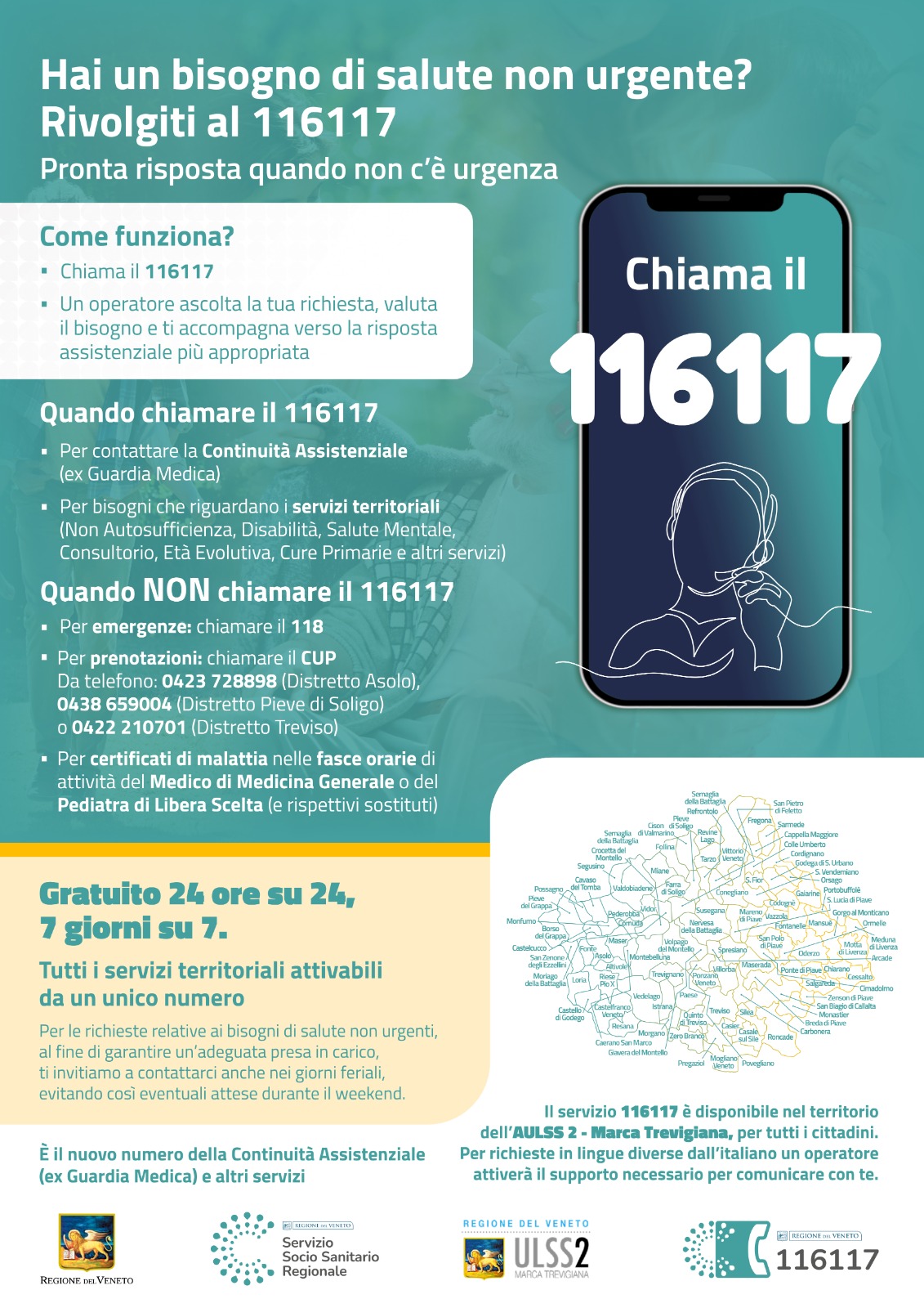 A partire da mercoledì 4 marzo 2026 alle ore 20:00, sarà attivo in tutto il territorio dell’AULSS 2 Marca trevigiana il 116117, il numero unico europeo dedicato ai bisogni sanitari non urgenti e ai servizi sanitari e sociali territoriali a bassa priorità di cura.