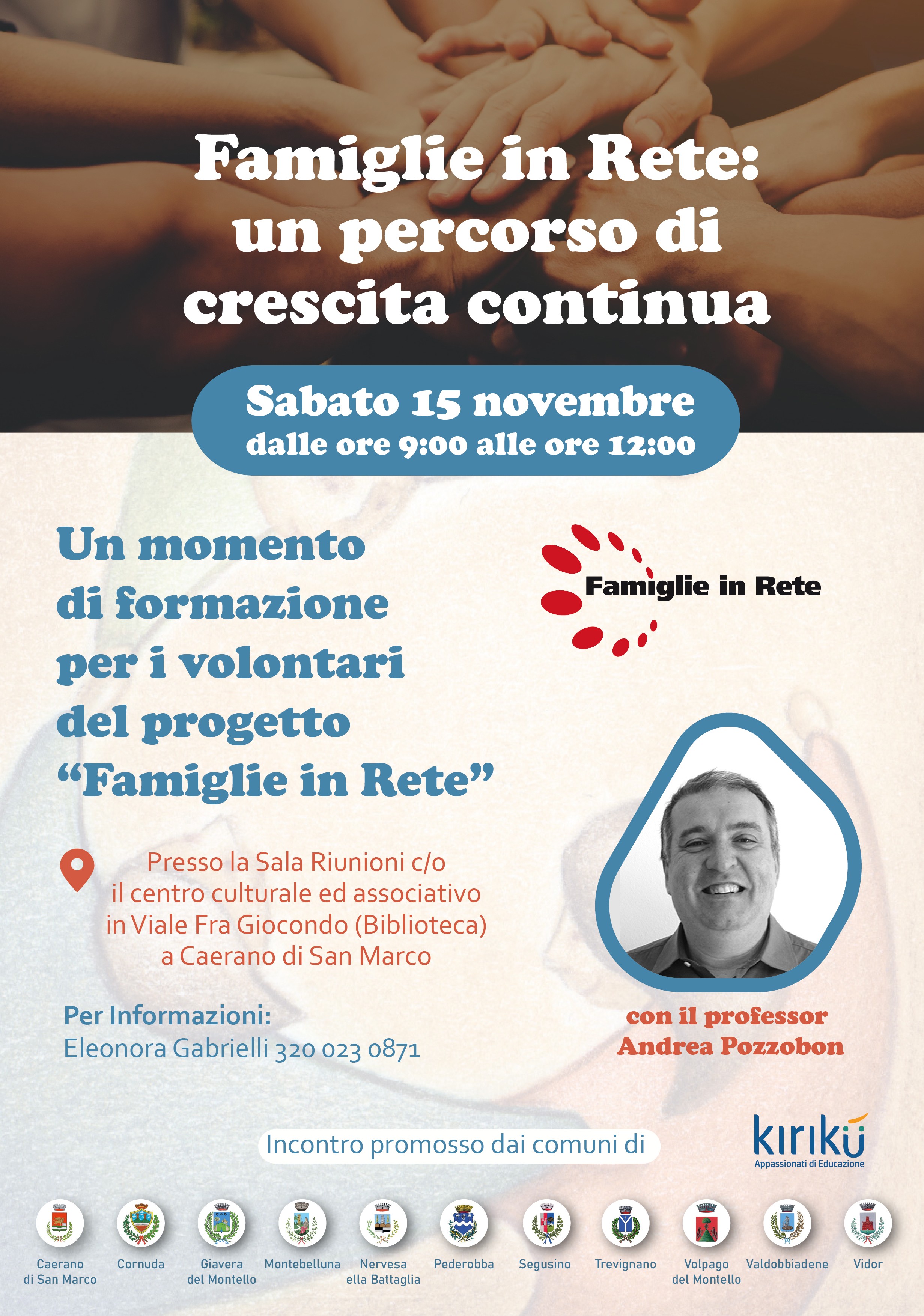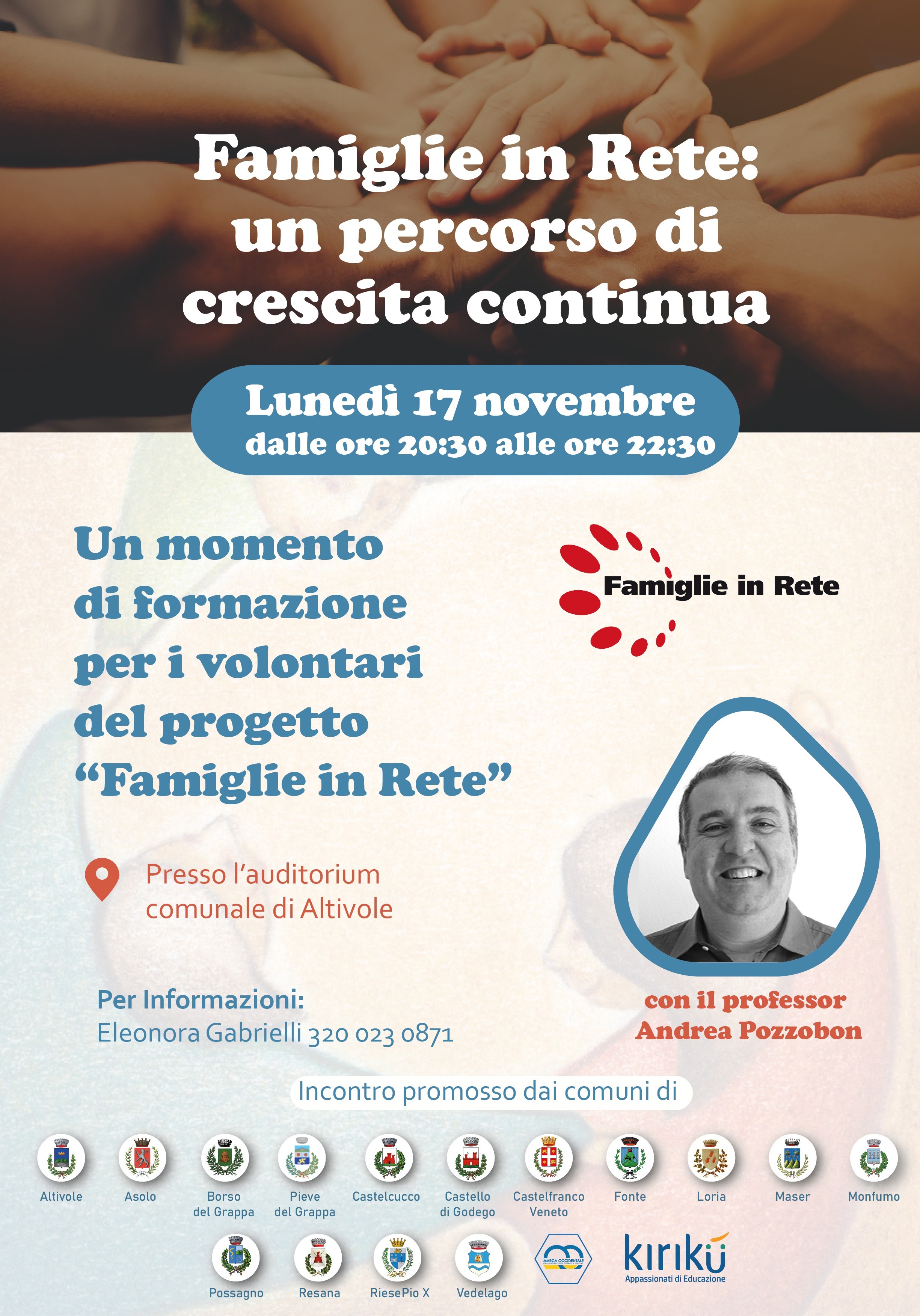 La Cooperativa Kirikù, con la collaborazione dei Comuni di Altivole, Asolo, Borso del Grappa, Pieve del Grappa, Castelcucco, Castello di Godego, Castelfranco Veneto, Fonte, Loria, Maser, Monfumo, Possagno, Resana, Riese Pio X e Vedelago, nell'ambito del progetto "Famiglie in rete: un percorso di crescita continua", nasce il desiderio di programmare due incontri volti alla formazione dei volontari del Progetto.